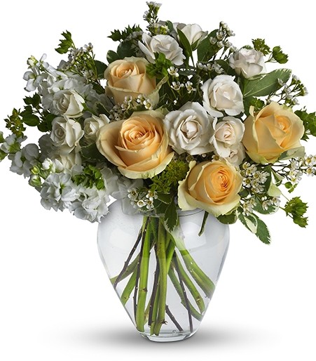 The Elegant Sympathy Bouquet is curated to bring peace to loved ones or friends and to let them know they are in your thoughts. A bouquet of fresh flowers such as peach roses, crème spray roses, white stock, waxflower, and more are gathered in a beautiful clear vase.