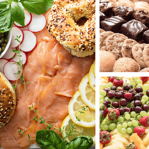 Nova Lox with assorted traditional and freshly made salads, including tuna salad, egg salad, and whitefish salad. Each tray is custom presented on a ready-to-serve catering tray, in addition to Fresh Fruit and Dessert Platters. Served with assorted bagels, cheese and a side tray of lettuce, tomato, onion, and cucumber.