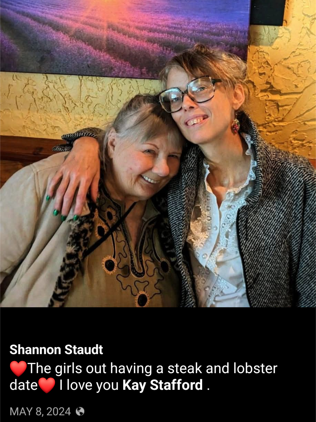 Kay and her husband, Will Stafford will be interred together at a Celebration of Life service to be held graveside on August 23rd 2025, at 11:00am at Mt. Zion Cemetery in Estacada, Oregon.