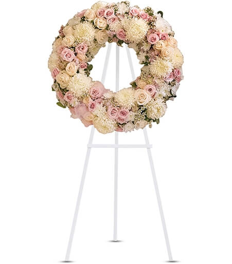 The Peace in Eternity Wreath presents soft pastel blossoms to help soothe and comfort. Gorgeous pink hydrangea, roses, white chrysanthemums, waxflower, and more are adorned by pink organza to represent an eternal circle of peace.